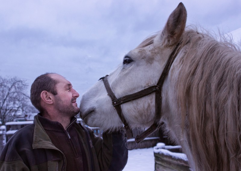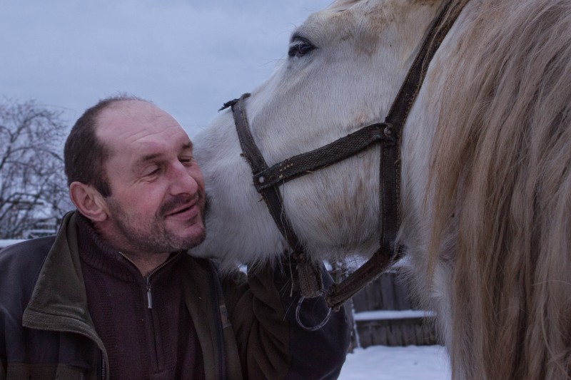 Отношения у этого парня с лошадью хорошие, но не поэтические. Обнимет, похлопает, но и спуску не даёт. Возвращался на железнодорожную станцию, я на телеге запряжённой лошадью. И лошадь-то практически красная.