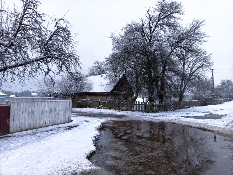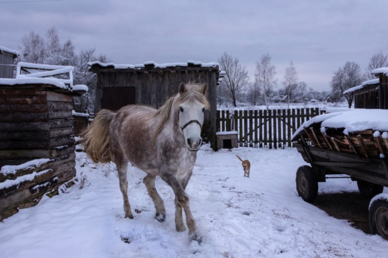 Память в критические моменты жизни также может вести себя двояко — или её отшибает, или она проявляет забытые моменты жизни. Не так давно я был в одной деревне. Деревня старая. Люди постепенно покидают её. А когда люди уходят, проступает фактура. Ветхие строения, старые потёртые поверхности, брусчатая заснеженная дорога с ямами и лужами — это ценный материал для фотографа, но для оставшихся жителей радости большой не представляет. Жизнь как бы идёт назад к архаичным истокам. Рудименты становятся обычным жизненным явлением. Так, наверное, и появилась на главной дороге телега, запряжённая лощадью.